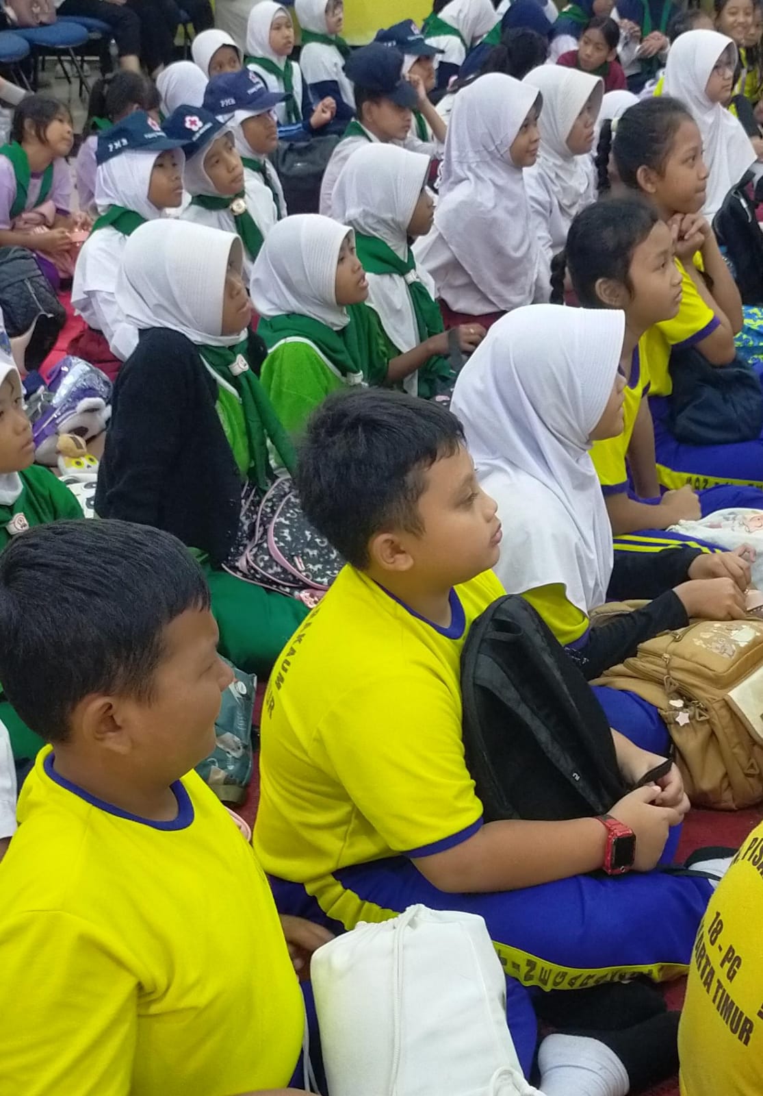 Siswa-siswi SDN Jatinegara Kaum 14 tampak mudah dikenali dengan kaos olahraga berwarna kuning cerah dipadukan dengan celana biru. Mereka duduk rapi di barisan depan, memperhatikan setiap penjelasan dengan seksama.